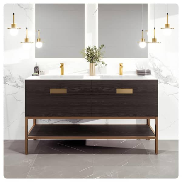 Iris 59 in. Double Sink Gray Oak Bath Vanity with White Solid Surface Top (Assembled)