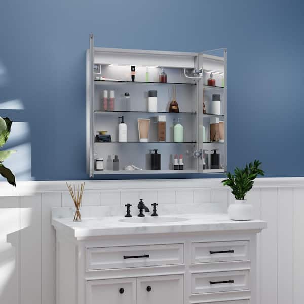 28 in. W x 30 in. H Rectangular Sliver Aluminum Recessed/Surface Mount Left Medicine Cabinet with Mirror LED