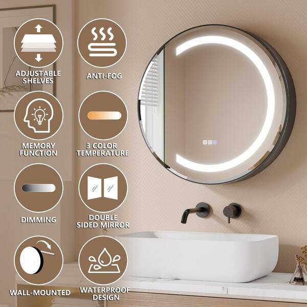 Radii 30 in. W x 30 in. H Round Silver Aluminum Medicine Cabinet with Mirror, Dimmable LED, Soft-Close Hinge