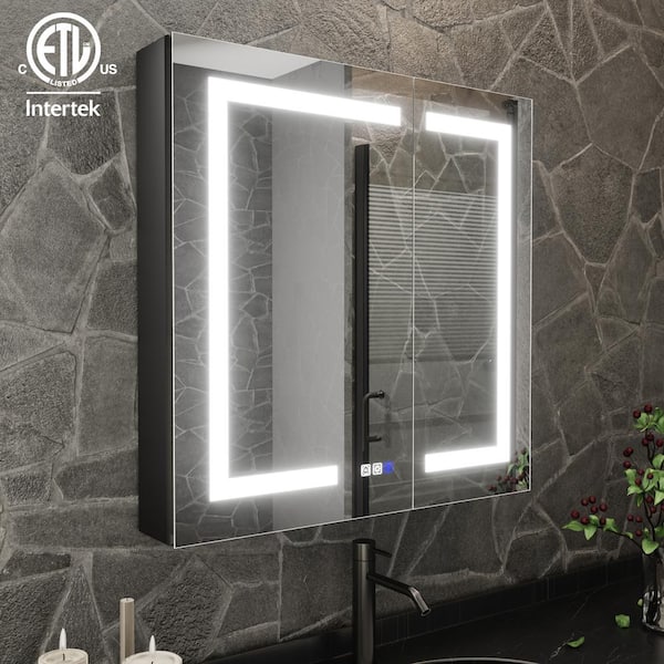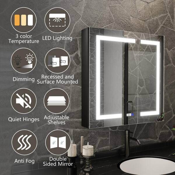 ShineX 30 in. W x 30 in. H Rectangular Black Aluminum Recessed/Surface Mount Dual Swing Medicine Cabinet with Mirror LED