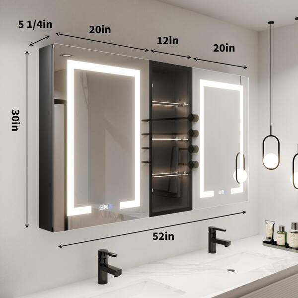 ShineX 52 in.W x 30 in.H Rectangular Black Aluminum Recessed/Surface Mount Dual Swing Medicine Cabinet with Mirror LED