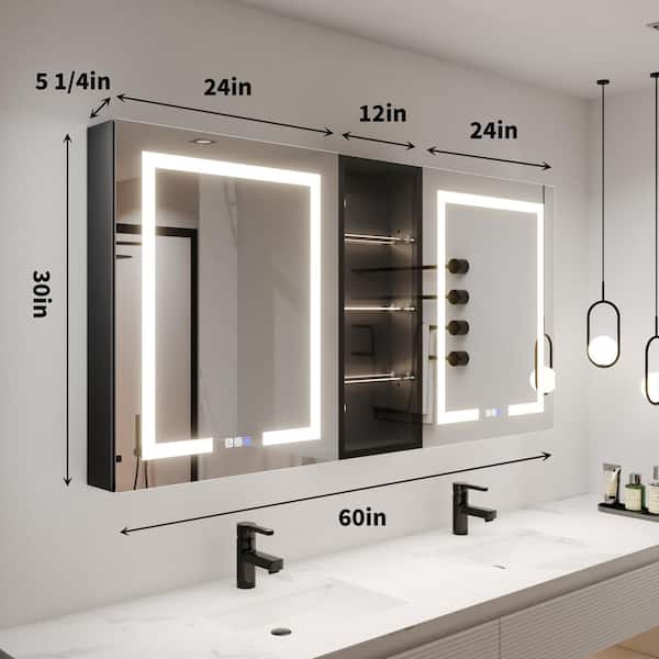 ShineX 60 in.W x 30 in.H Rectangular Black Aluminum Recessed/Surface Mount Dual Swing Medicine Cabinet with Mirror LED