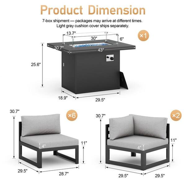 Extra Large Gray 9-Piece Aluminum Patio Fire Pit Conversation Set Deep Seating Sectional Sofa with Light Gray Cushions
