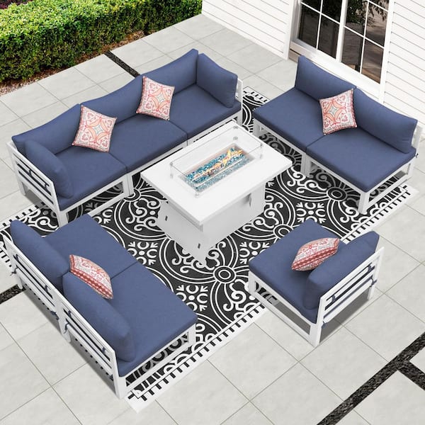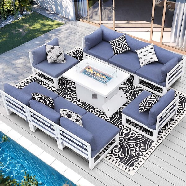 Extra Large White 9-Piece Aluminum Patio Fire Pit Conversation Set Deep Seating Sectional Sofa with Denim Blue Cushions