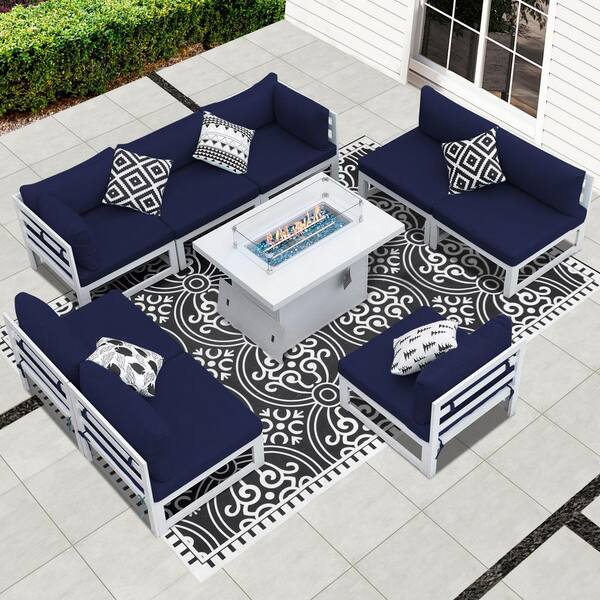 Extra Large White 9-Piece Aluminum Patio Fire Pit Conversation Set Deep Seating Sectional Sofa with Navy Blue Cushions