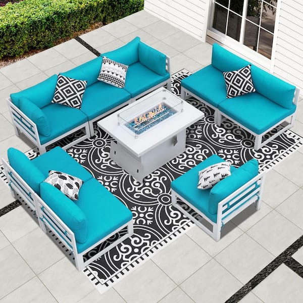 Extra Large White 9-Piece Aluminum Patio Fire Pit Conversation Set Deep Seating Sectional Sofa with Teal Cushions