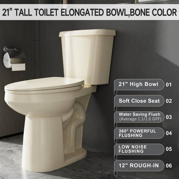 Extra Tall 21 in. 2-Piece Toilet 1.1/1.6 GPF Dual Flush Elongated Raised Toilet in Bone with Soft Close Seat for Seniors