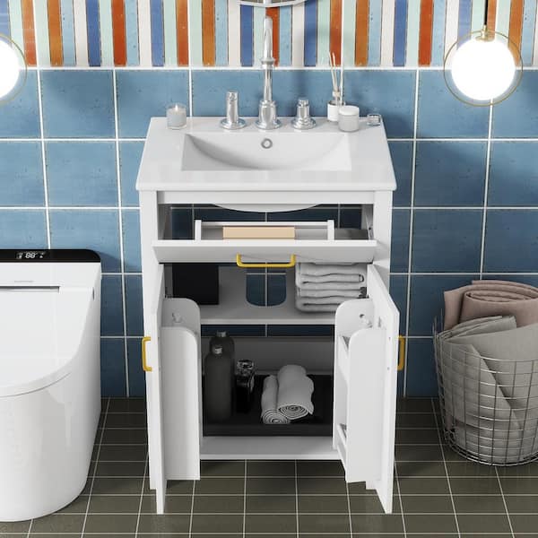 24 in. Single Sink Freestanding White Solid Wood Frame Bath Vanity with White Ceramic Top Unassembled