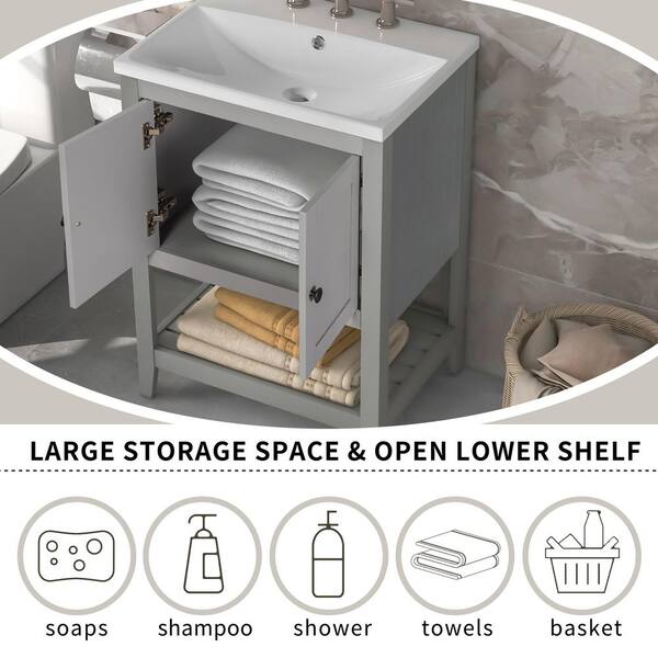 24 in. W x 17.8 in. D x 33.6 in. H Single Sink Solid Wood Frame Freestanding Bath Vanity in Gray with White Ceramic Top