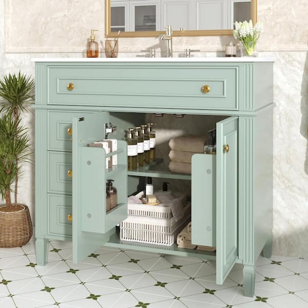 36 in. W Single Sink Freestanding Solid Rubberwood Frame Bath Vanity in Brown Oak with White Ceramic Top