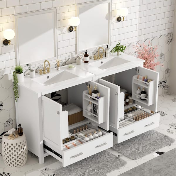 60 in. Double Sink Freestanding Separate White Bath Vanity Set with White Ceramic Top