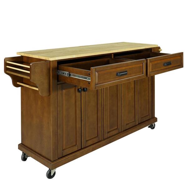 Cambridge Brown Rubberwood Tabletop 60.5 in. Kitchen Island with Adjustable Shelves and Casters