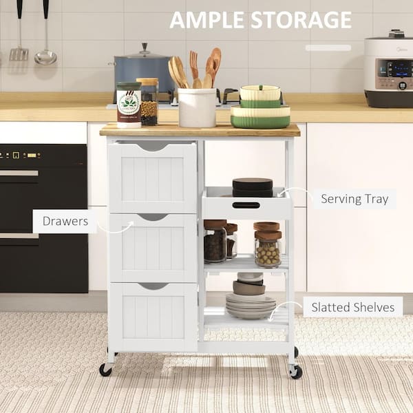 Compact Rolling White Wood Top 26.5 in. Kitchen Island Cart with Drawers and Open Shelves