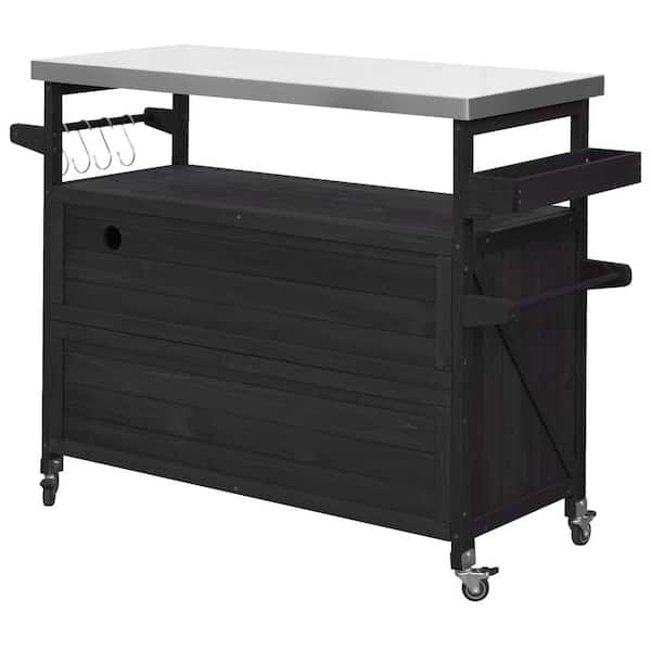 Farmhouse Rolling Black Stainless Steel Metal Top 50 in. Solid Wood Kitchen Island Cart with Spice Rack and Towel Rack