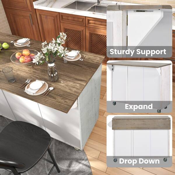 Peak Rolling White Drop-leaf Wood Countertop 52 in. Kitchen Island with Adjustable Shelve