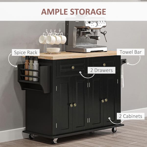 Rolling Black Rubberwood Top 44 in. Kitchen Island with Drawers and Adjustable Shelves