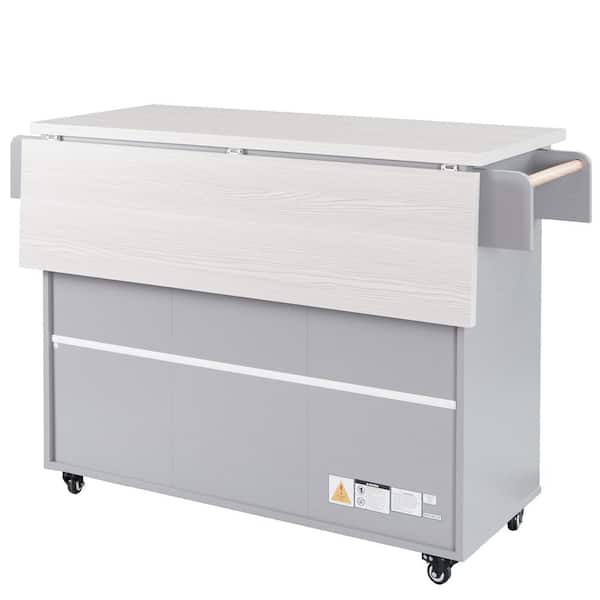 Rolling Gray Drop Leaf Wood Countertop 51 in. Kitchen Island with Trash Can Storage Cabinet, Adjustable Shelf