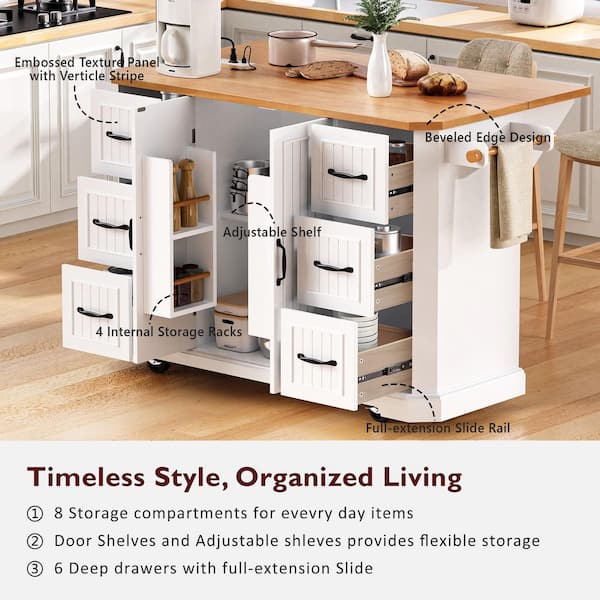 Rolling White Rubber Wood Veneer Drop Leaf Tabletop 56 in. Kitchen Island Cart with Power Outlet, 6-Drawers