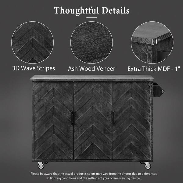Wave Stripes Black Wood Drop Leaf Tabletop 51 in. Kitchen Island with Wheels and Solid Wood Feet