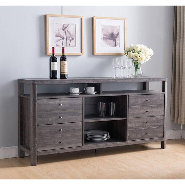Distressed Grey Buffet Table with Four Drawers and Storage Shelves