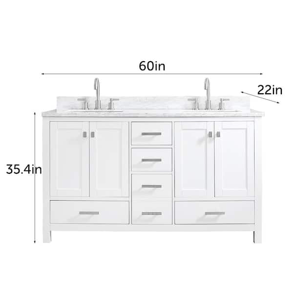60 in. Double Sink Bath Vanity in White with Marble Top and Ceramics Sink 2 Soft-Close Doors and 5-Drawers