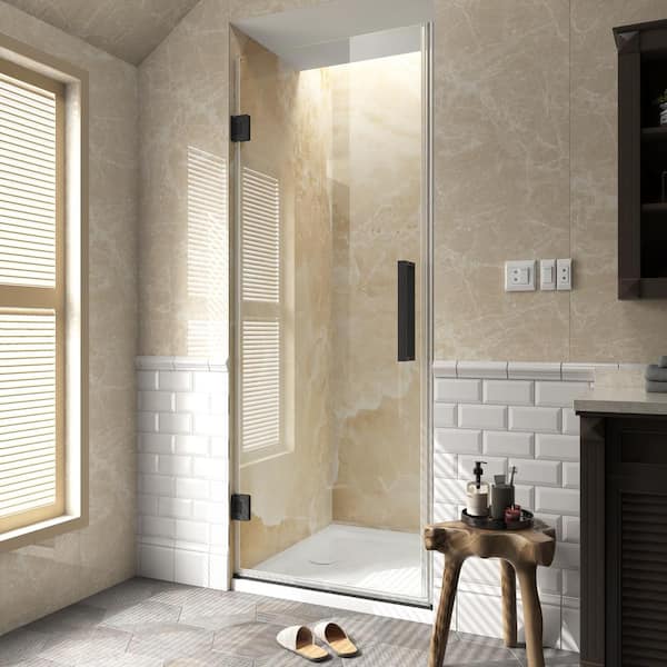29 in. W x 72 in. H Hinged Frameless Shower Door in Black Finish with 3/8 in. (10mm) Clear and Tempered Glass