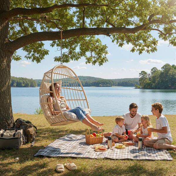 1-Person Beige PE Wicker Porch Swing Egg Chair with Beige Cushion