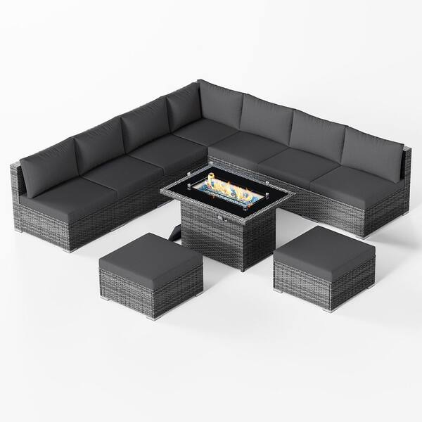 10 Pieces Gray Wicker Patio Conversation Set Deep Sectional Seating Set with Charcoal Cushions and Fire Pit Table