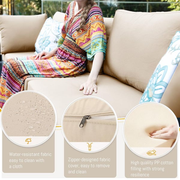 9 Pieces Large Size Espresso Wicker Patio Conversation Deep Seating Sectional Sofa Set with Fire Pit and Beige Cushions