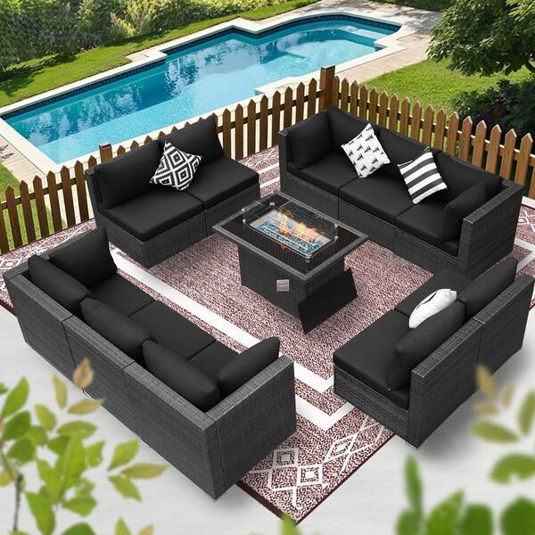 Eden Gray 10-Seat 11-Piece Wicker Patio Fire Pit Deep Seating Sofa Set with Black Cushions and 43 in. Firepit Table