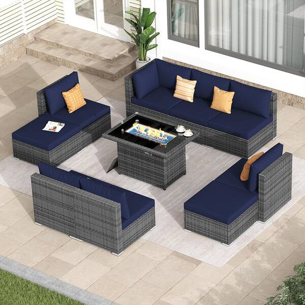 High-End 10 Piece Charcoal Wicker Patio Fire Pit Deep Sectional Seating Sofa Set with Navy Blue Cushions with Ottomans