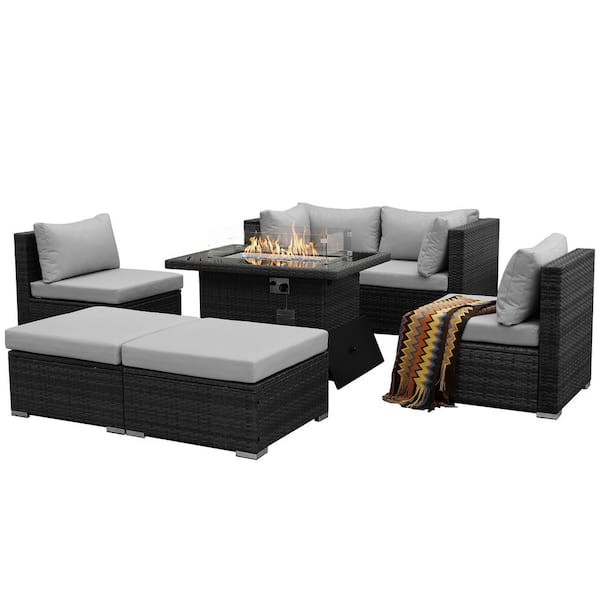 Luxury 7-Piece Charcoal Wicker Patio Fire Pit Conversation Sectional Deep Seating Sofa Set with Light Grey Cushions