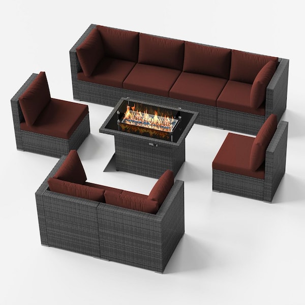 Luxury 9-Piece Grey Wicker Patio Extra Large Deep Seating Sectional Sofa Set with Dark Red Cushions and Fire Pit Table