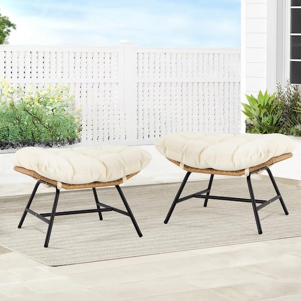 Metal PE Wicker Outdoor Ottoman with Beige Cushion (2-Pieces)