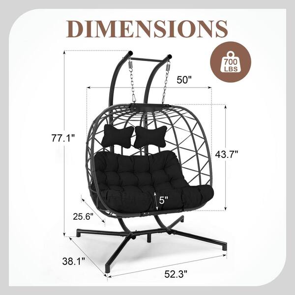 Oversized 2-Person Patio Gray Wicker Hanging Egg Swing Chair Indoor Outdoor Porch Lounge with Stand and Black Cushion