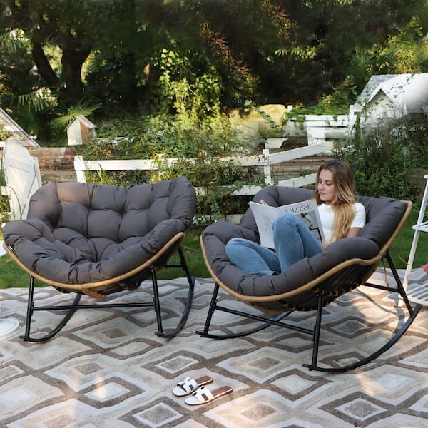 Oversized Beige PE Wicker Outdoor Rocking Chair Papasan Chair with Gray Cushion (2-Pieces)