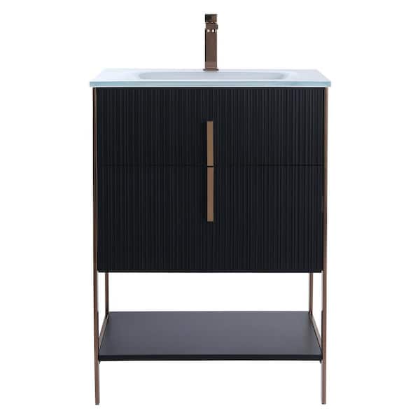 24 in. W x 18 in. D x 33.5 in. H Bath Vanity in Black Matte with Glass single hole top With Rose Gold Hardware
