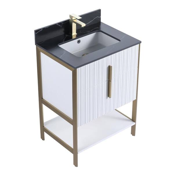 24 in. W x 18 in. D x 33.5 in. H Bath Vanity in White with Black Marble Stone Top with Satin Brass Hardware