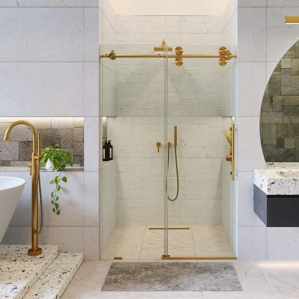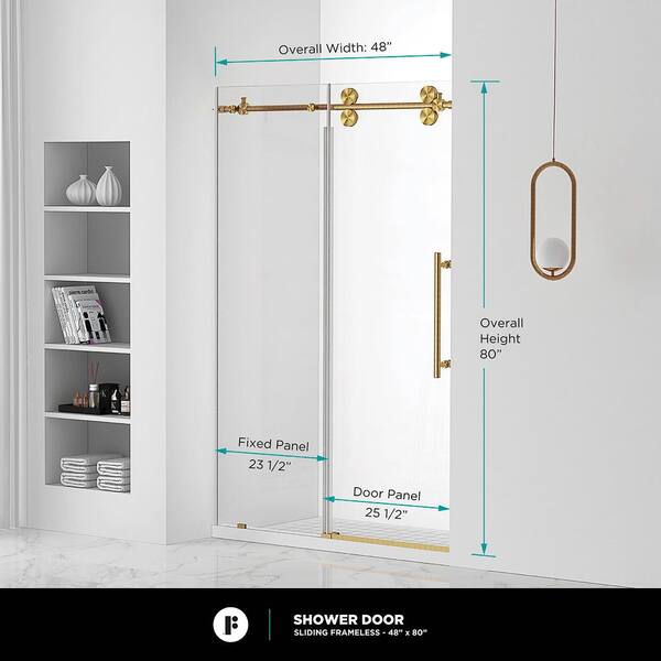 48 in. W x 80 in. H Single Sliding Frameless Shower Door in Satin Brass with Tempered Clear Glass