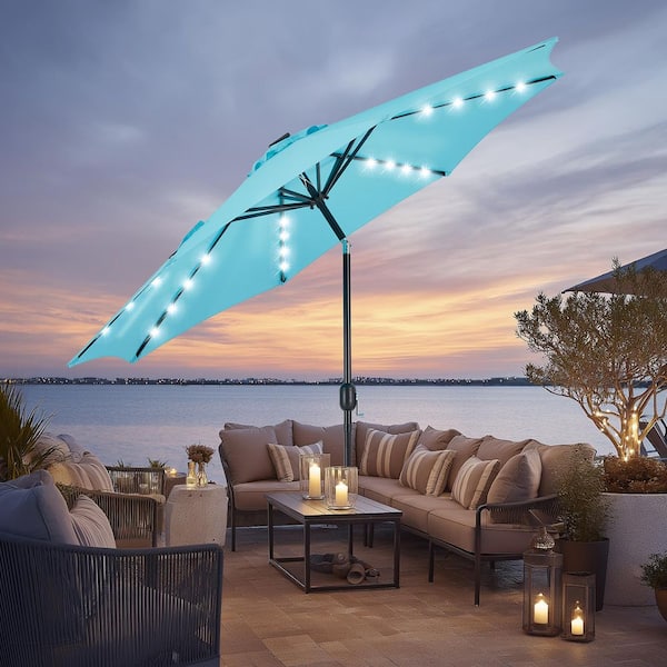 10ft Solar Polyester 32 LED Lighted Patio Umbrella with Tilt Adjustment and UV-Resistant Fabric in Blue