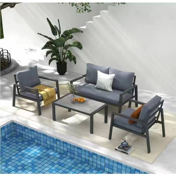 4-Piece Aluminum Outdoor Patio Lounge Sofa Set with Removable Gray Cushions and Tempered Glass Coffee Table