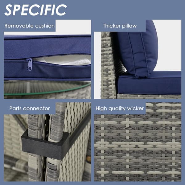 9-Pieces Half Moon Wicker Outdoor Furniture Sofa Sectional Set with Blue Cushions and 2-Overlapping Tables
