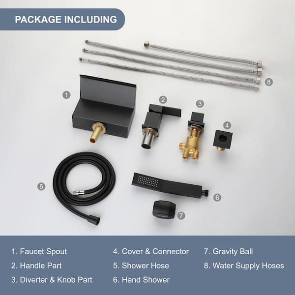 2-Handle Tub Deck-Mount Waterfall Roman Tub Faucet with Hand Shower 4-Hole Brass Bathtub Filler in Matte Black