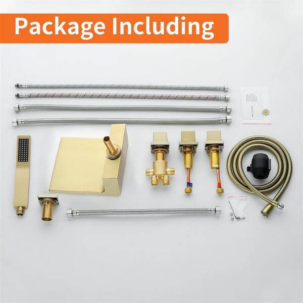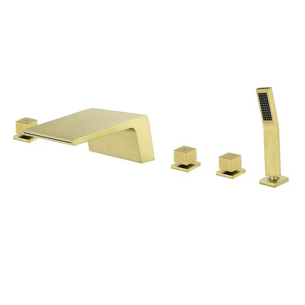 3-Handle Deck Mount Roman Tub Faucet with Hand Shower Brass 5 Hole Waterfall Bathtub Filler with Sprayer in Brushed Gold
