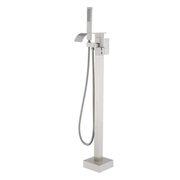 Single-Handle Freestanding Tub Faucet with Handheld Shower Brass Waterfall Floor Mount Bathtub Filler in Brushed Nickel