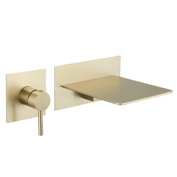 Single Handle Wall Mounted Bathroom Faucet with Valve Modern Brass Waterfall Bathroom Sink Basin Taps in Brushed Gold