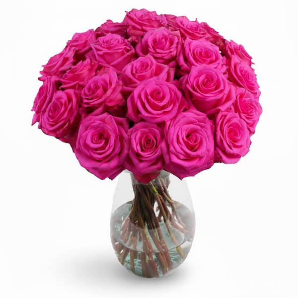 FLORAVAS 25-STEM HOT PINK ROSES WITH GLASS VASE-FRESH CUT ROSE ARRANGEMENT