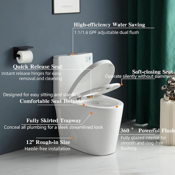 12 in. 1-Piece 1.1/1.6 GPF Dual Flush ADA Height Elongated Toilet in White Soft Close Seat