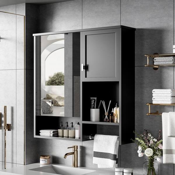 29 in. W x 28 in. H Rectangular Surface Mount Medicine Cabinet with Mirror and Towels Bar in Black