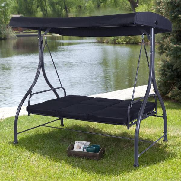 3 Seats Metal Patio Swing Hammock with Black Cushions and Adjustable Tilt Canopy